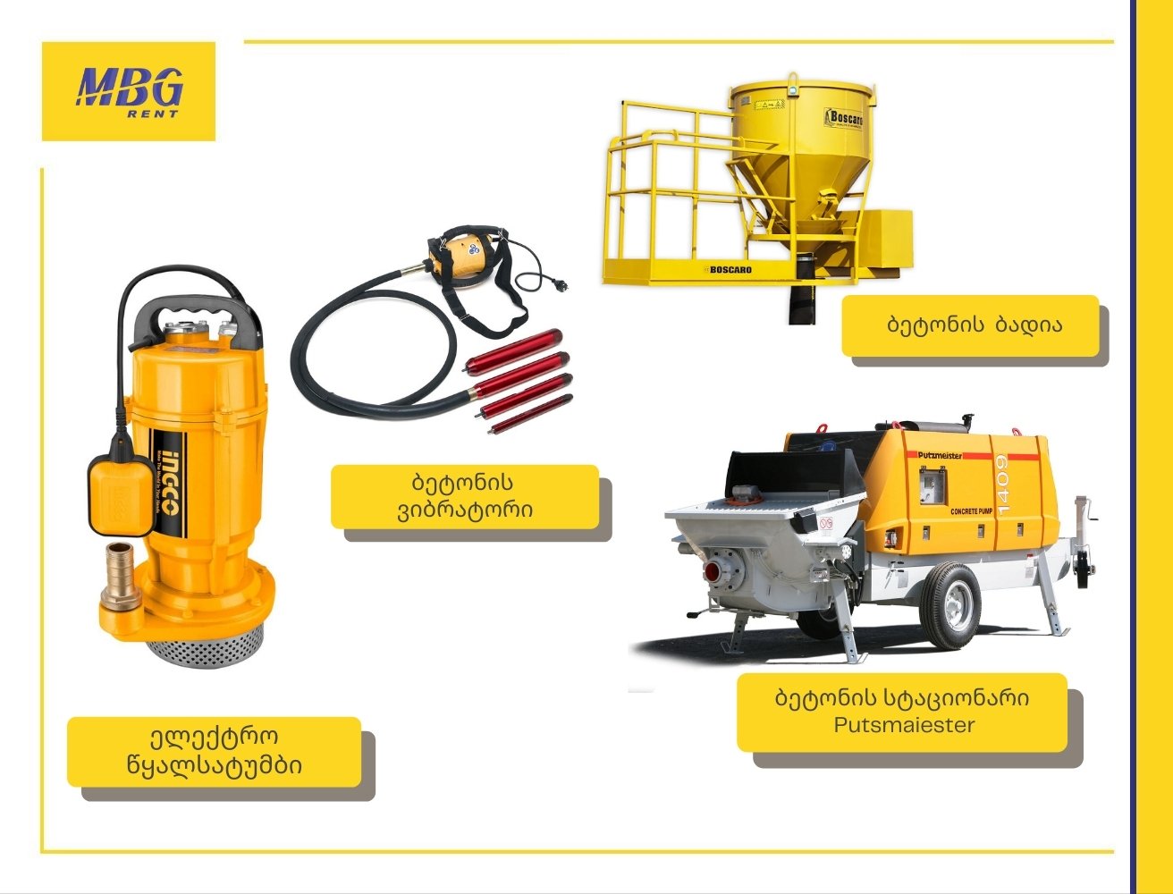 დგარი; კოჭი; ფანერი; ელექტრო წყალსატუმბი; ბეტონის ვიბრატორი; ბეტონის ბადია; ბეტონის სტაციონარი Putsmaiester; ავსტრიული ბრენდის, Doka-ს გადახურვის ფილის ყალიბი; Doka-ს კედლის ყალიბი; Doka-ს კოლონის ყალიბი; სივრცული და ფასადის ხარაჩო; Hilti-ს ალმასის ჭრისა და ბურღვის ტექნოლოგიით შესრულებული სამუშაოები და სხვ.